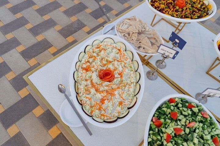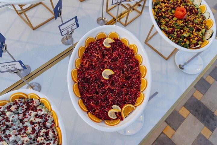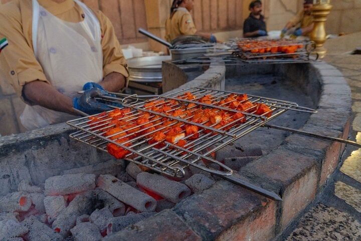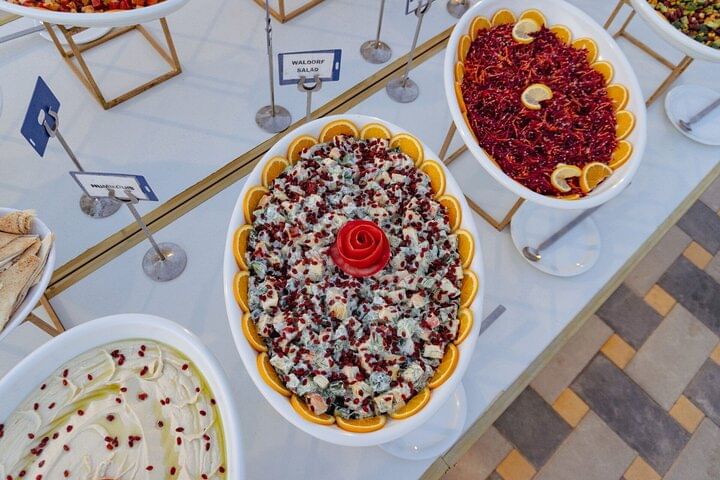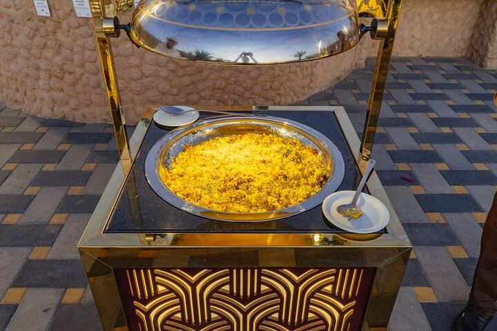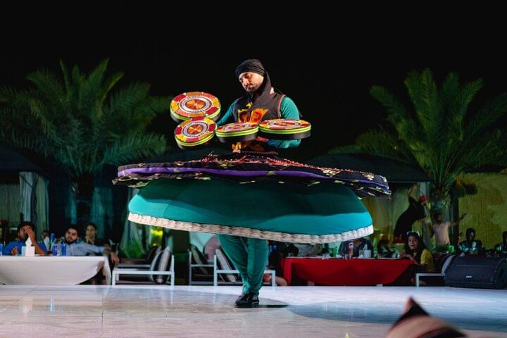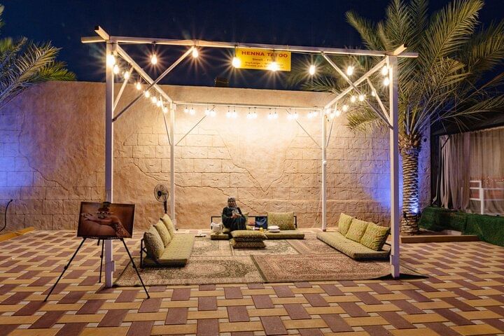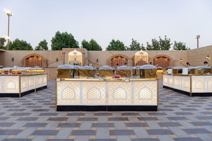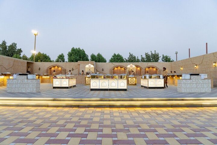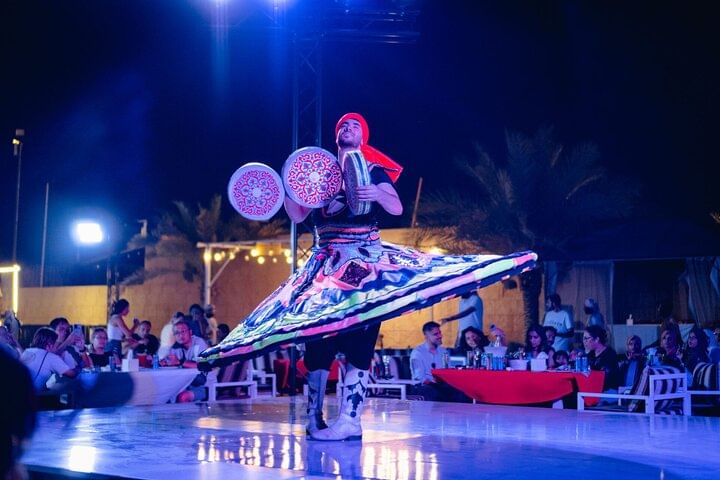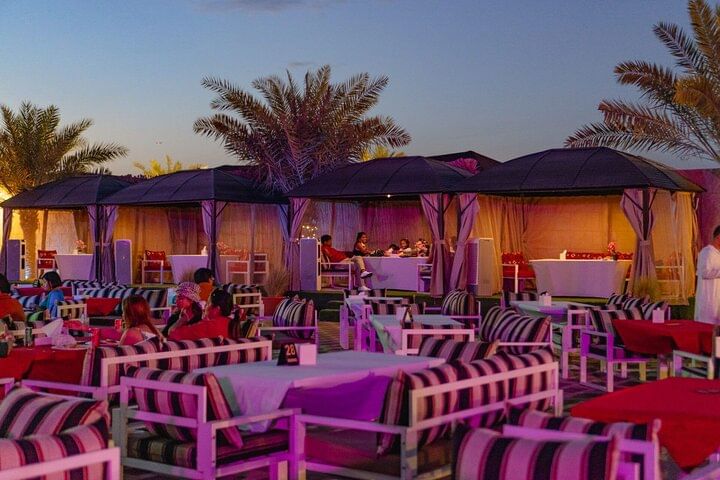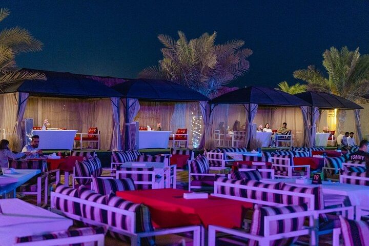 Relax in your own private gazebo while enjoying personalized service. Indulge in thrilling dune bashing, a peaceful camel ride, and the traditional delights of Arabic coffee and dates. Enjoy unique henna tattoos, captivating entertainment shows, and a sumptuous BBQ buffet with a variety of vegetarian and non-vegetarian options.